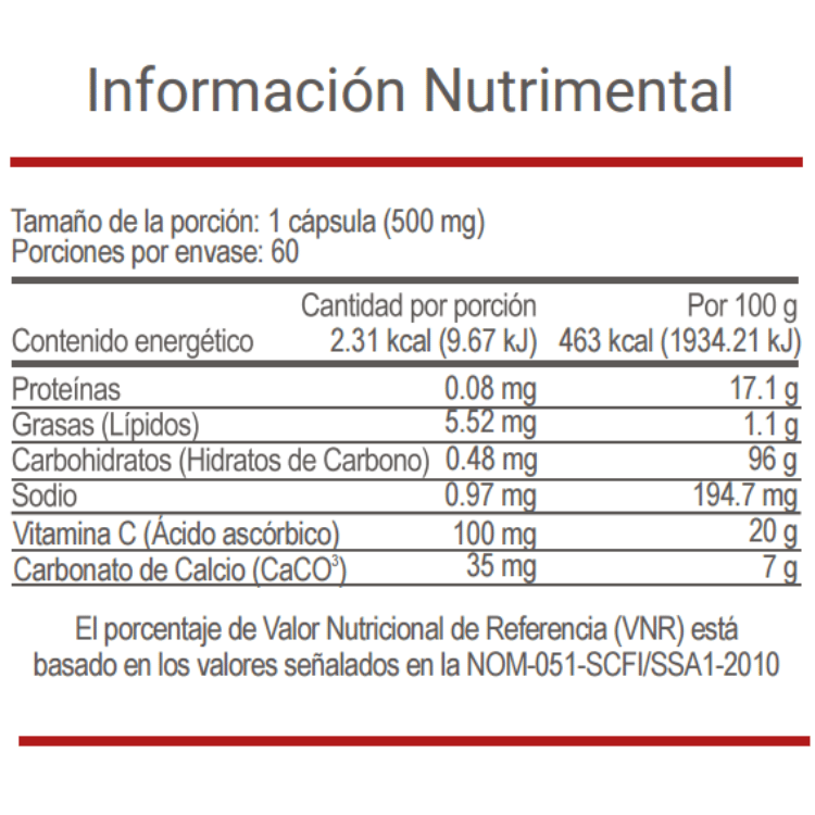 Polvo de ajo (Allium sativum), Cartílago de tiburón (Lactato de escualamina), Vitamina C (Ácido ascórbico), Curcumina 95% curcuminoides (Curcuma longa), Polvo de fruto de guaraná (Paullinia cupana), Carbonato de calcio (CaCO), Polvo de hoja de moringa (Moringa Oleifera), Polvo de flor de romero (Salvia rosmarinus), Metilsufonilmetano (MSM) y Silica.