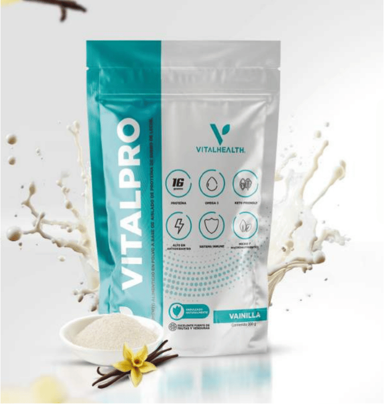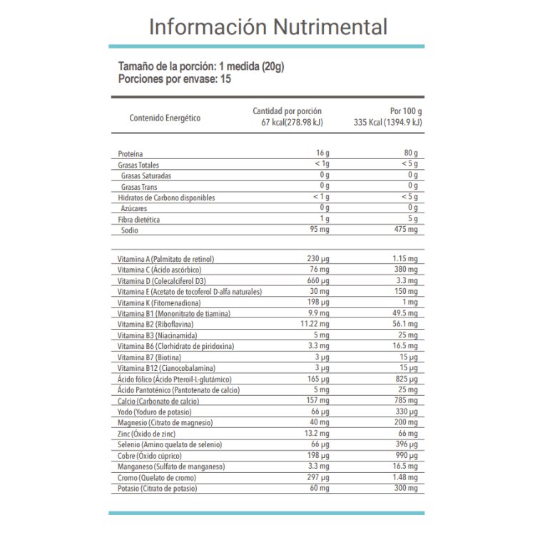 Aislado de proteína de suero de leche, Aislado de proteína de soya, Colágeno hidrolizado, Inulina de agave, Sabor Natural de Vainilla, Canela, Extracto de hoja de stevia (Stevia rebaudiana), Mezcla de minerales VITALPRO, Mezcla de vitaminas VITALPRO, Dióxido de Silicio, Amilasa, Proteasa, Aceite de alga en polvo, Betabel (Beta vulgaris), Brócoli (Brassica oleracea), Extracto de Cordyceps (Cordyceps sinensis), Espinaca (Spinaca oleracea), Espirulina, Fresa, Manzana Verde, Mango, Mangostán, Maqui, Mora Azul, Plátano, Pitaya roja, Extracto de Ganoderma (Ganoderma lucidum), Extracto de Shiitake (Lentinula edodes), Tomate, Uva, Extracto de Cúrcuma al 95% de Curcuminoides (Curcuma longa), Ácido alfa-lipoico, Alga verdiazul afa (Aphanizomenon Flos-Aquae) y Coenzima Q10.